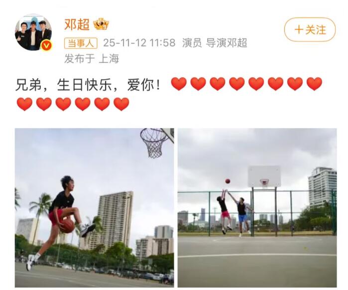 11月12日,演员邓超发文为儿子等等庆祝14岁生日,配文:“兄弟,生日快乐,爱你!”,并晒出父子篮球场对决照片。
